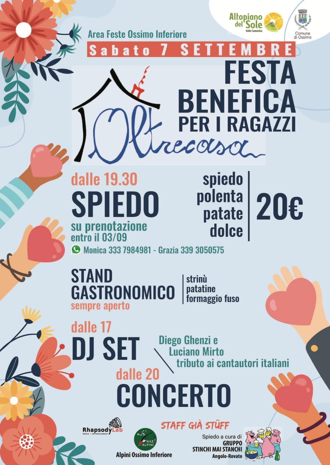 Piazza San Damiamo a Ossimo Inferiore ospiterà sabato 7 settembre la festa benefica per i ragazzi di “Oltrecasa, un’associazione locale con finalità civiche, solidaristiche e di utilità sociale rivolte alle persone con disabilità e fragilità e alle loro famiglie.