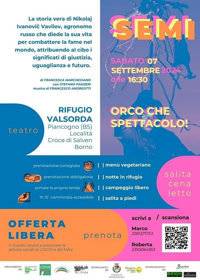 Dopo il successo dello scorso anno, “L’Oco! Orco Che Orto!” riporta la magia del teatro in Val Sorda, con lo spettacolo “SEMI”. La rappresentazione è ispirata alla storia vera di Nikolaj Ivanovič Vavilov, agronomo russo che diede la sua vita per combattere la fame nel mondo, attribuendo al cibo i significati di giustizia, uguaglianza e futuro.