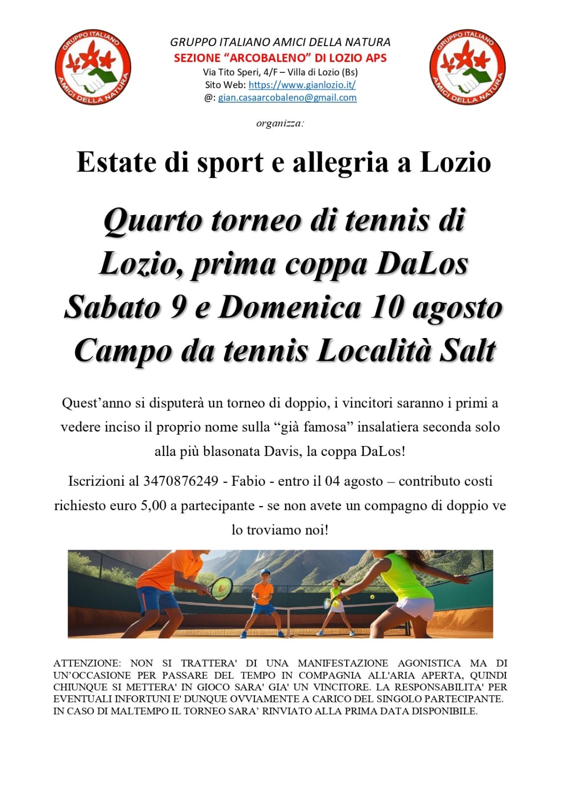 πŸ—‚οΈ Tipologia evento: Torneo sportivo 🏒 Organizzato da: Sezione Arcobaleno di Lozio del Gruppo Italiano Amici della Natura APS πŸ“ Luogo: CAMPO DA TENNIS - LOCALITΓ€ SALT πŸ“– Descrizione evento: Da quest'anno il torneo si svolgerΓ  in doppio, con in palio una mitica e rustica insalatiera come la ben piΓΉ nota Coppa Davis! πŸ”— Link utili: 🌐 Sito Web: Nessun link disponibile πŸ“² Facebook: Nessuna pagina disponibile πŸ“· Instagram: Nessun profilo disponibile πŸ”„ - Aggiornato automaticamente dal sistema