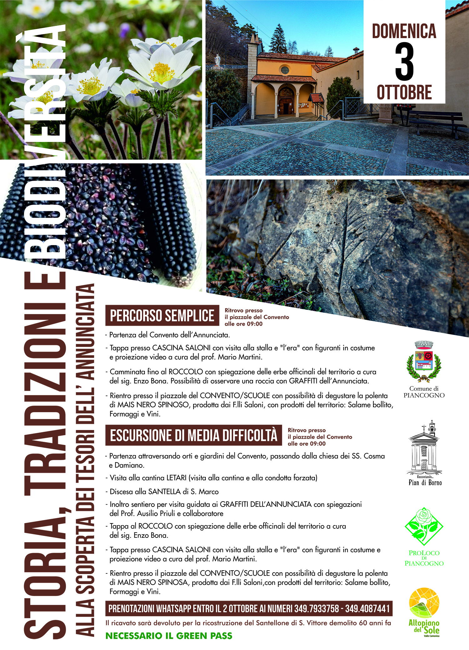 Per chi non fosse stato presente all’evento dello scorso settembre “Piancogno in Vigna” (clicca qui per maggiori informazioni), una buona occasione è quella di ripercorrere le tracce dei pellegrini nel mese di ottobre. L’itinerario ha inizio nella piazza del Municipio di Piamborno, da cui si imbocca il sentiero in direzione “Piazzuola”, proseguendo poi verso località “Belarna”. Da qui si continua sull’antica Via delle Volte, percorrendo il sentiero “4 venti” e giungendo infine all’Annunciata. Il tragitto è molto panoramico, lungo circa 6 km, e caratteristiche sono le coltivazioni dei vitigni della zona. Un consiglio per gli amanti dell’enogastronomia è quello di visitare le cantine dislocate lungo il percorso, prenotando la propria degustazione tramite i canali dedicati.