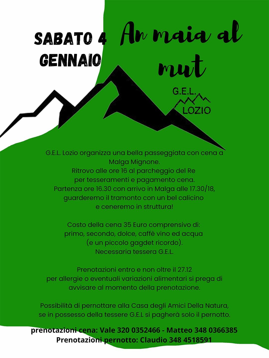 Il G.E.L di Lozio organizza una bella passaggiata serale con cena in Malga Mignone. Sabato 4 gennaio alle ore 16:00 è previsto il ritrovo a Villa di Lozio, in località Re, e alle 16:30 avrà inizio la camminata verso la Malga Mignone, dove è in programma l’aperitivo e la cena. Per info e prenotazioni è possibile contattare Valentina: +39 320 0352466 oppure Matteo: +39 348 0366385.