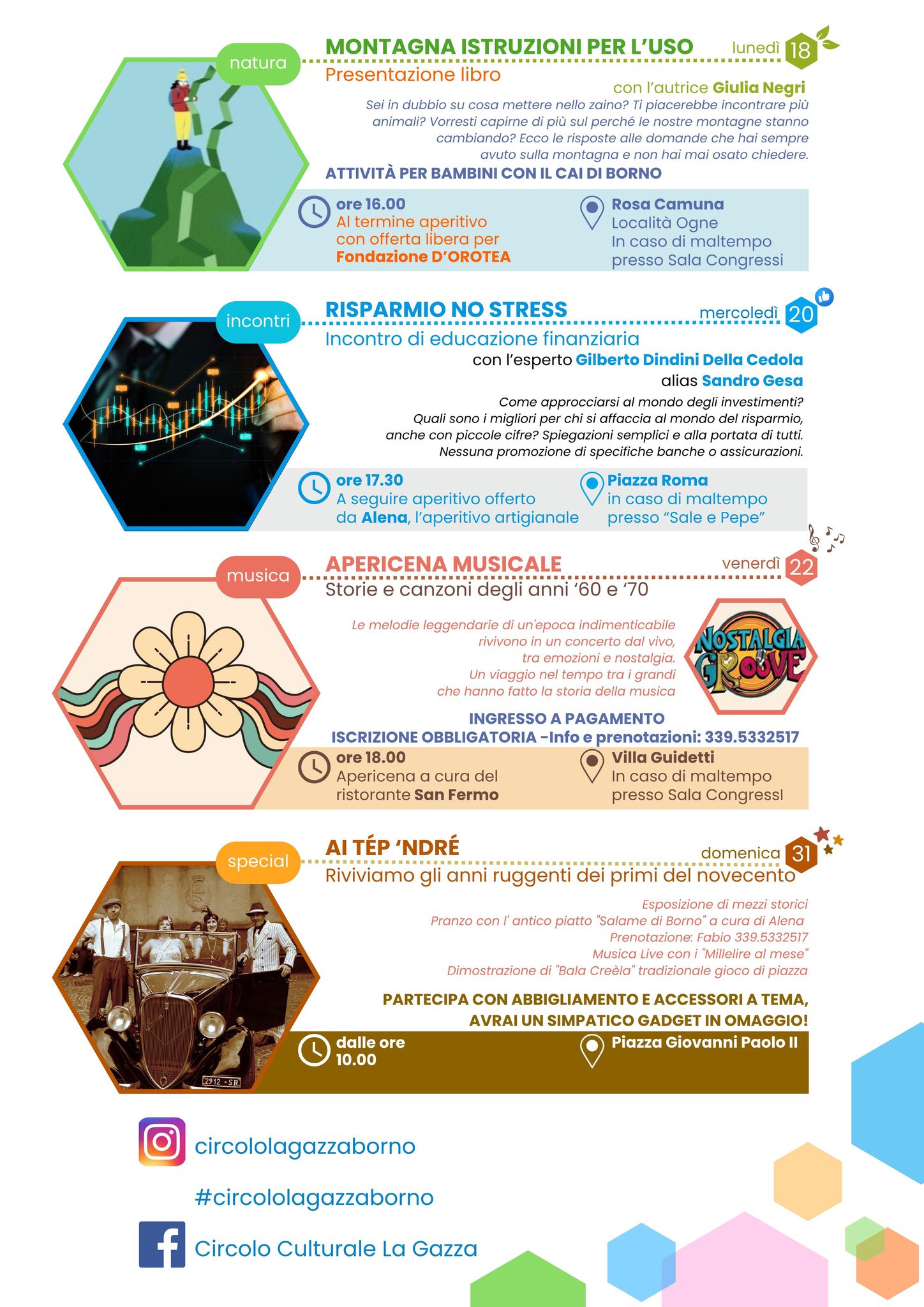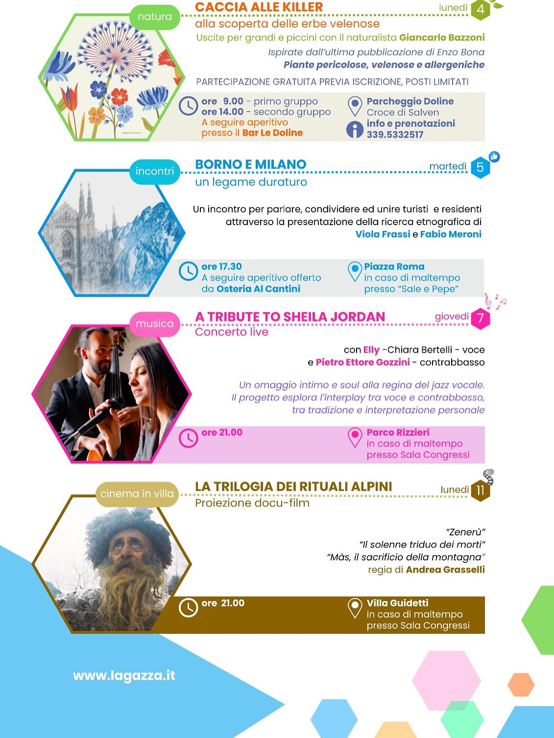 Nel mese di agosto l’Associazione Culturale “La Gazza” propone un ricco programma di appuntamenti. Si comincia lunedì 4 agosto con l’evento Caccia alle killer, un’escursione guidata alla scoperta delle erbe velenose. Martedì 5 agosto in piazzetta Roma si terrà l’incontro Borno e Milano: un legame duraturo, per parlare, condividere e unire turisti e residenti attraverso la presentazione della ricerca etnografica di Viola Frassi e Fabio Meroni.