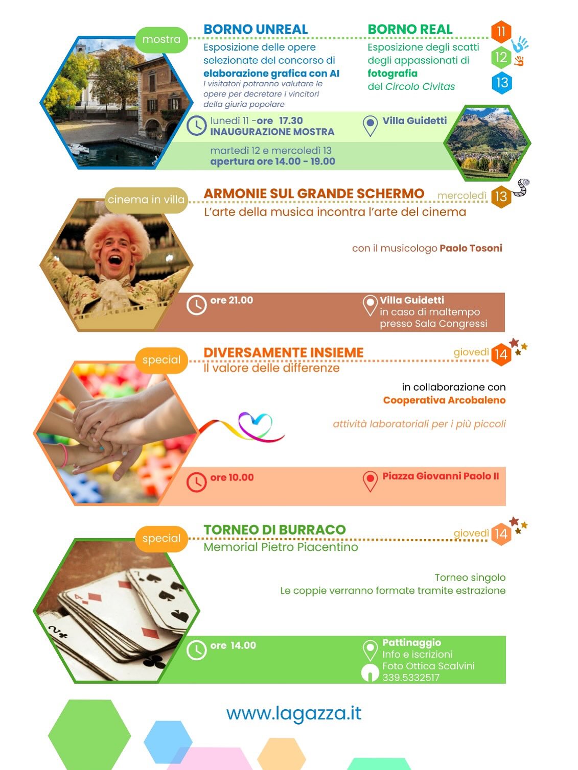 Lunedì 11 agosto in Villa Guidetti si inaugura l’esposizione delle opere Borno Unreal – Borno Real, accessibile fino a mercoledì 13 dalle 14:00 alle 19:00. In Villa Guidetti si terrà anche la proiezione del docu-film La Trilogia dei rituali Alpini (lunedì 11 alle ore 21:00) e l’evento Armonie sul grande schermo nella serata di mercoledì 13.