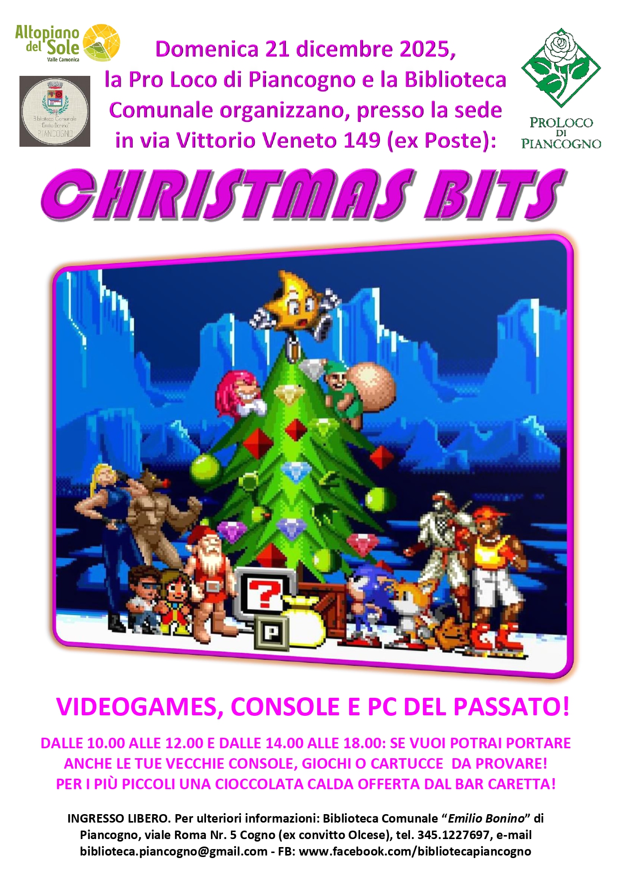 🗂️ Tipologia evento: Laboratorio esperienziale & didattico 🏢 Organizzato da: Pro Loco e Biblioteca Comunale di Piancogno 📍 Luogo: SEDE DELLA PRO LOCO DI PIANCOGNO (EX UFFICIO POSTALE) 📖 Descrizione evento: Domenica 21 dicembre 2025, dalle ore 10.00 alle 12.00 e dalle 14.00 alle 18.00, la Pro Loco di Piancogno e la Biblioteca Comunale "Emilio Bonino" organizzano "Christmas Bits", una giornata dedicata al retrogaming e retrocomputing, alle console, videogiochi e PC del passato che si terrà presso la sede della […]