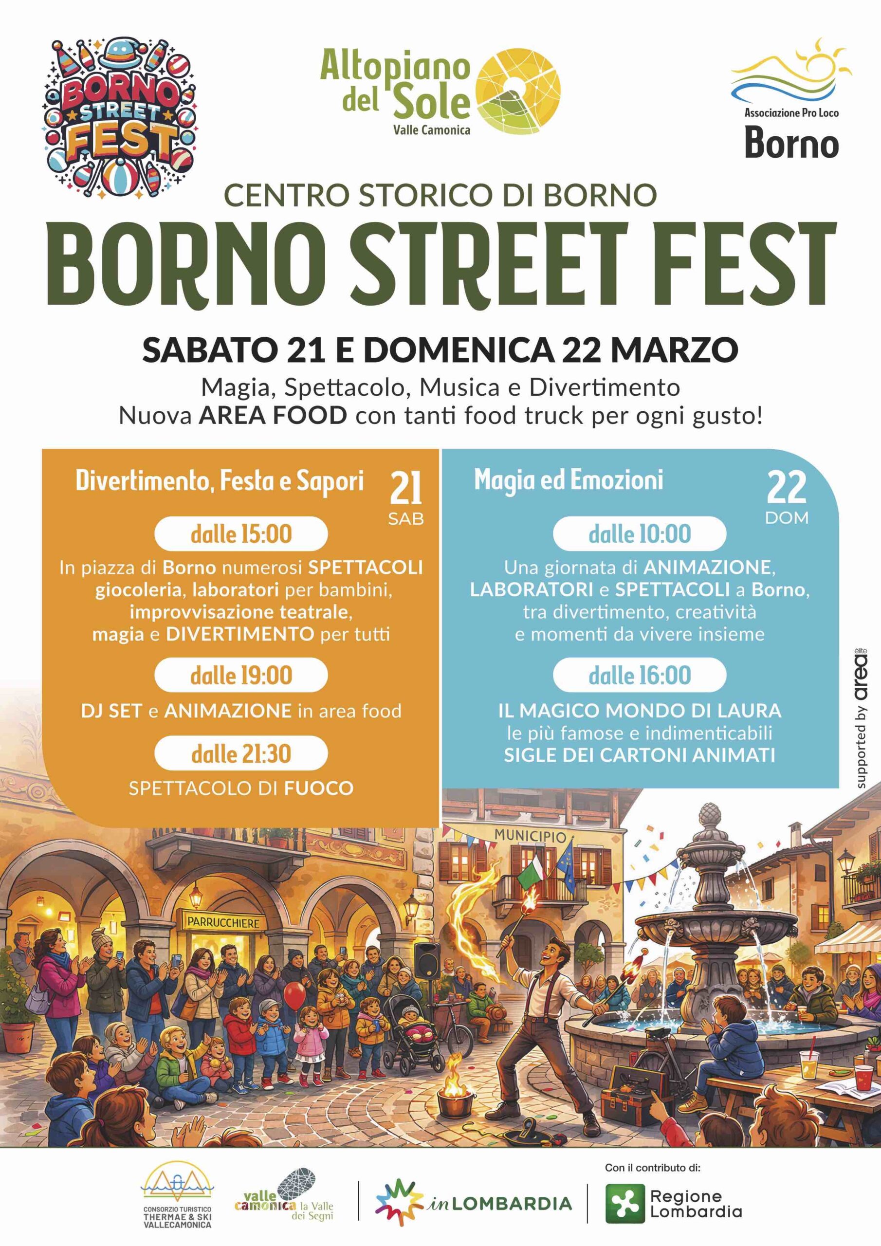 🎉 Borno Street Fest – Seconda Edizione 🎭 Le strade di Borno si animano e si trasformano in un palcoscenico vivo fatto di spettacoli e meraviglia! Artisti di strada, magia, clown e performance sorprendenti coinvolgeranno grandi e piccoli in un’esperienza unica. Tra laboratori creativi, animazione e tante sorprese, il paese si riempie di energia, colori e divertimento. Un evento da vivere, condividere e ricordare!
