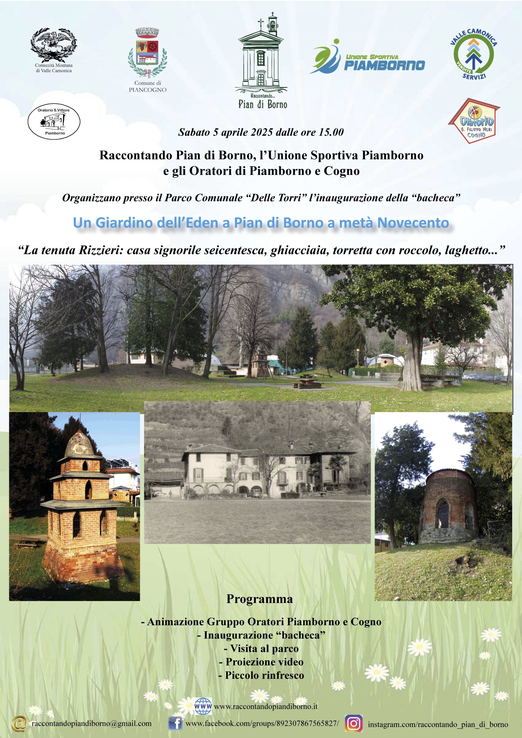 🗂️ Tipologia evento: Escursione & Visita guidata 🏢 Organizzato da: Raccontando Pian di Borno, Unione Sportiva Piamborno, Oratori di Piamborno e Cogno 📍 Luogo: PARCO COMUNALE DELLE TORRI 📖 Descrizione evento: La tenuta Rizzieri: casa signorile seicentesca, ghiacciaia, torretta con roccolo, laghetto" 🔗 Link utili: 🌐 Sito Web: https://raccontandopiandiborno.it/ 📲 Facebook: https://www.facebook.com/groups/892307867565827 📷 Instagram: https://www.instagram.com/raccontando_pian_di_borno/ 📎 (https://drive.google.com/file/d/1osHX1FJ5DM0vhjzqfOVQ1tkZZy3PYQM4/view) 🔄 - Aggiornato automaticamente dal sistema