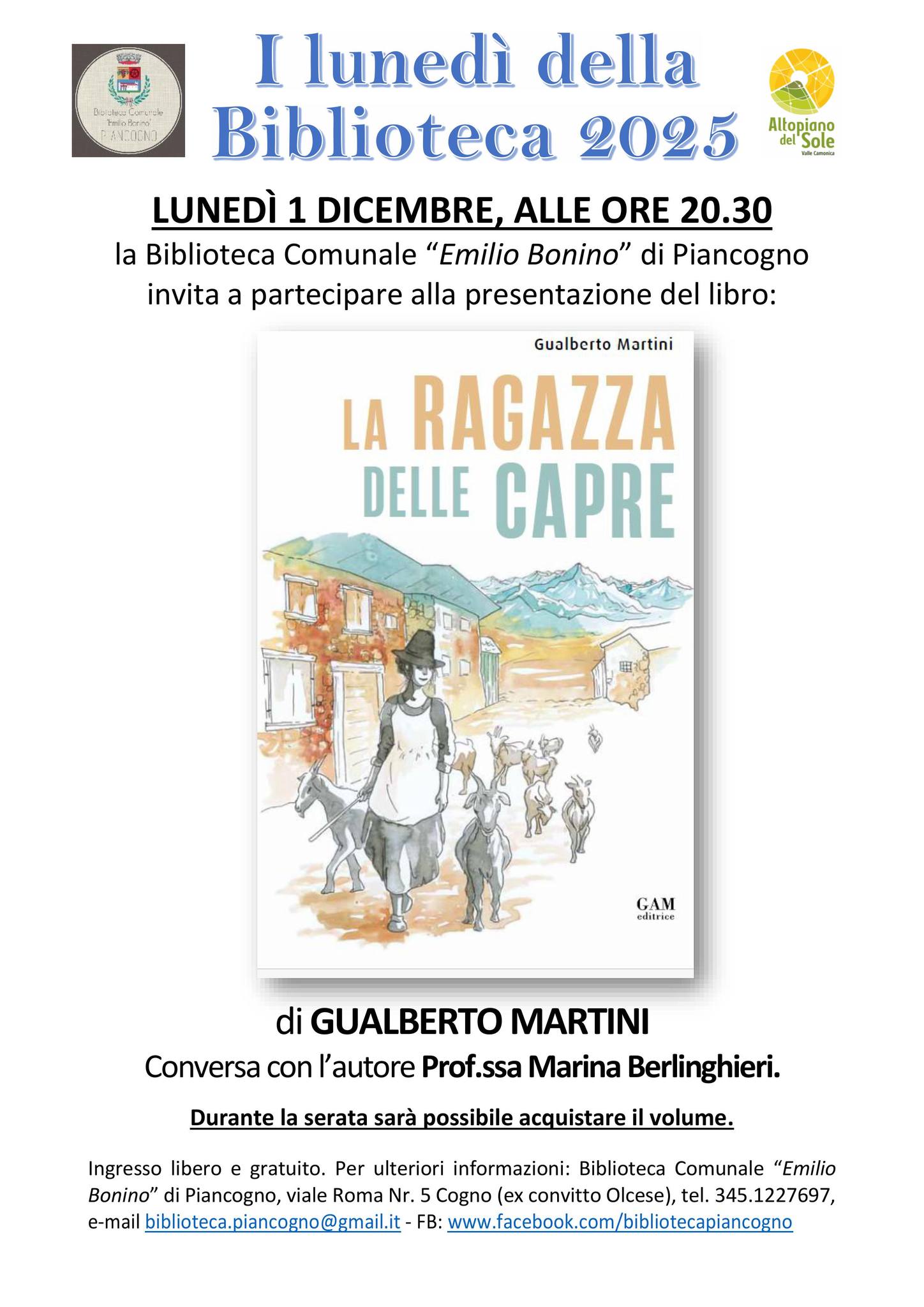 ποΈ Tipologia evento: Evento culturale π’ Organizzato da: Biblioteca Comunale "Emilio Bonino" di Piancogno π Luogo: BIBLIOTECA COMUNALE "EMILIO BONINO" π Descrizione evento: LunedΓ¬ 1 dicembre, alle ore 20.30 presso la sede al secondo piano dell'ex Convitto Olcese di Cogno, la presentazione del libro "la ragazza delle capre", dello scrittore e ristoratore camuno Gualberto Martini pubblicato dalla casa editrice GAM. "Lβaria e le emozioni che si respiravano in quel piccolo mondo antico, che era Branzi nella prima metΓ del Novecento. […]