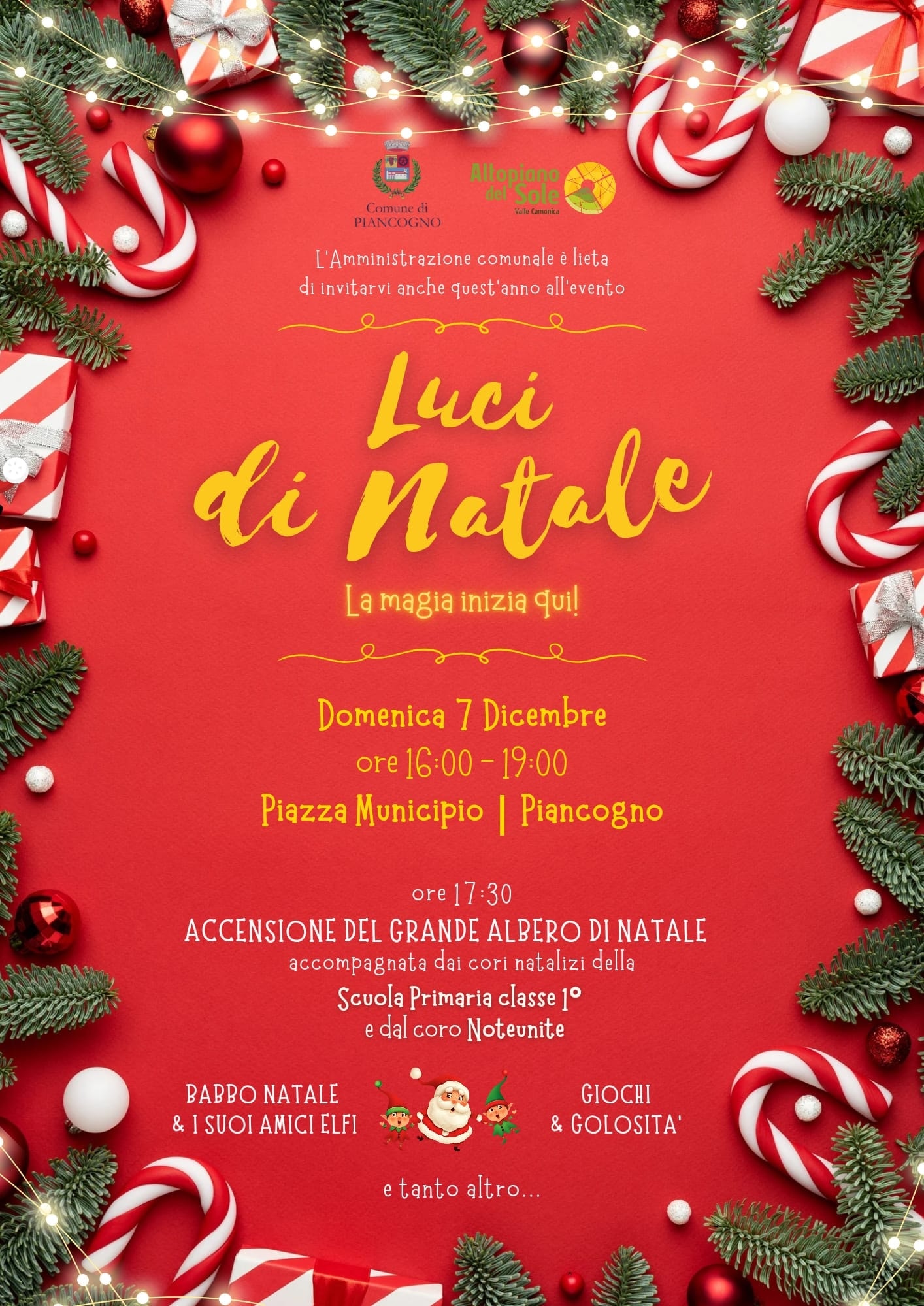 ποΈ Tipologia evento: Festa a tema π’ Organizzato da: Comune di Piancogno π Luogo: PIAZZA DEL MUNICIPIO π Descrizione evento: Accensione del grande albero di Natale π Link utili: π Sito Web: Nessun link disponibile π² Facebook: Nessuna pagina disponibile π· Instagram: Nessun profilo disponibile π - Aggiornato automaticamente dal sistema