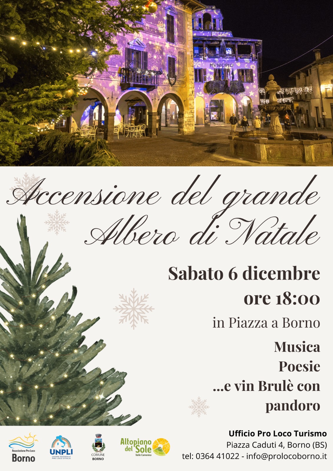 ποΈ Tipologia evento: Iniziativa religiosa & celebrazione tradizionale π’ Organizzato da: Pro Loco Borno π Luogo: PIAZZA BORNO π Descrizione evento: Vivi la magia della accensione del Grande Albero di Natale nella piazza di Borno, con canti, letture e alla fine vin brulΓ¨ e pandoro per tutti! π Link utili: π Sito Web: Nessun link disponibile π² Facebook: Nessuna pagina disponibile π· Instagram: Nessun profilo disponibile π - Aggiornato automaticamente dal sistema